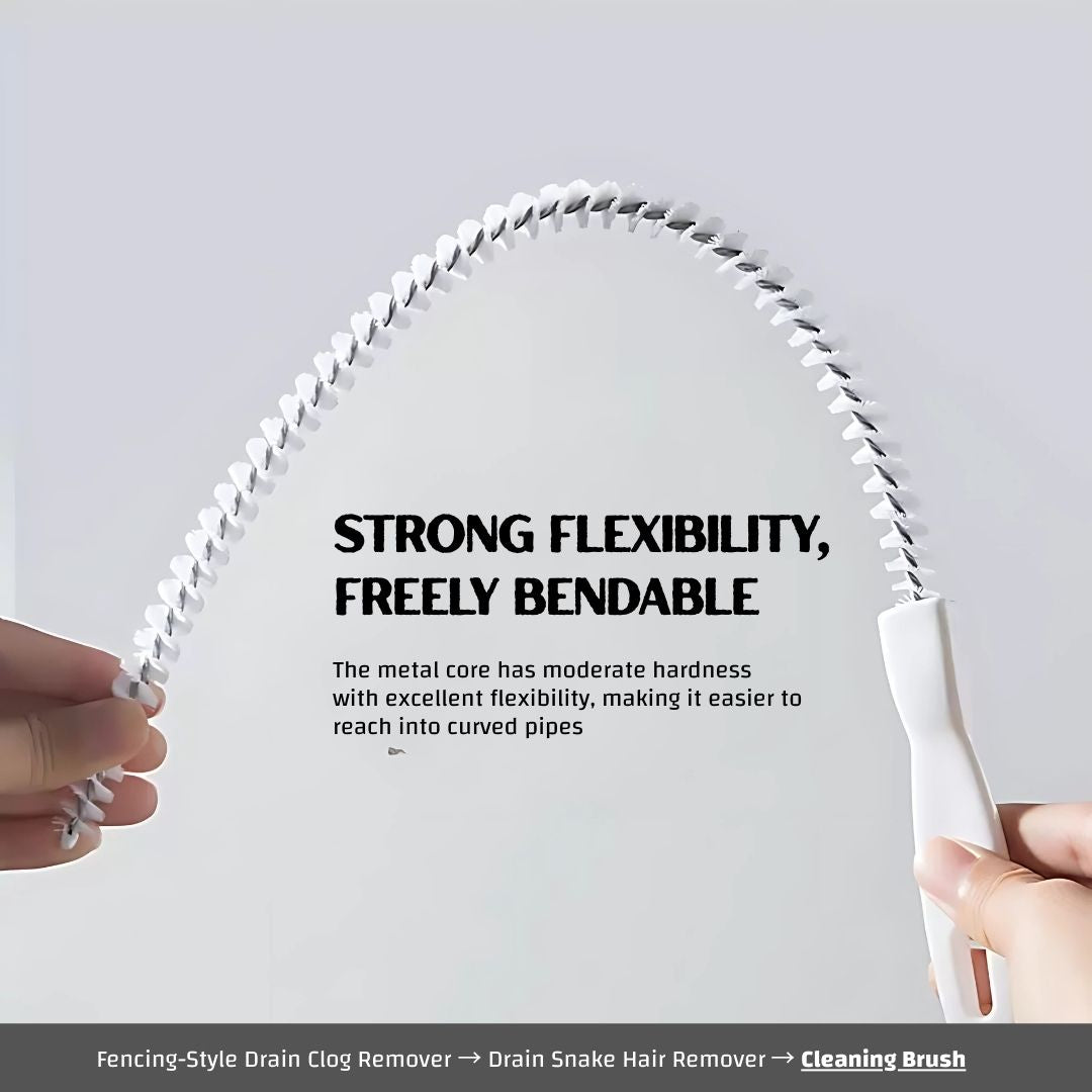 Spiral Pipe Cleaning Brush. Built with a sturdy yet flexible metal core for maneuverability inside curved pipes. Spiral bristles effectively “grab” hair, residue, soap scum, grease, and dirt. The extended 45cm/18in design reaches deep into pipes to tackle stubborn blockages. A simple twist motion locks onto debris for easy removal with minimal effort.