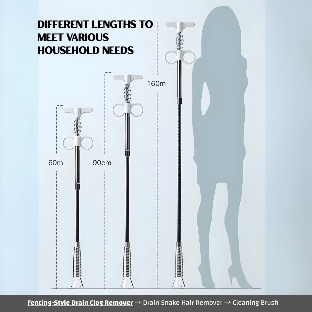 Fencing-Style Stainless Steel Claw Grabber. Designed with a fencing-style handle to protect your hands. The flexible rod bends easily and comes in three lengths (160cm/63in for floor drains, 90/35in cm for toilets, 60/24in cm for sinks). The stainless steel claw tip firmly grips clogs and can even retrieve lost items such as clothes blown under furniture, small toys, or dropped caps.